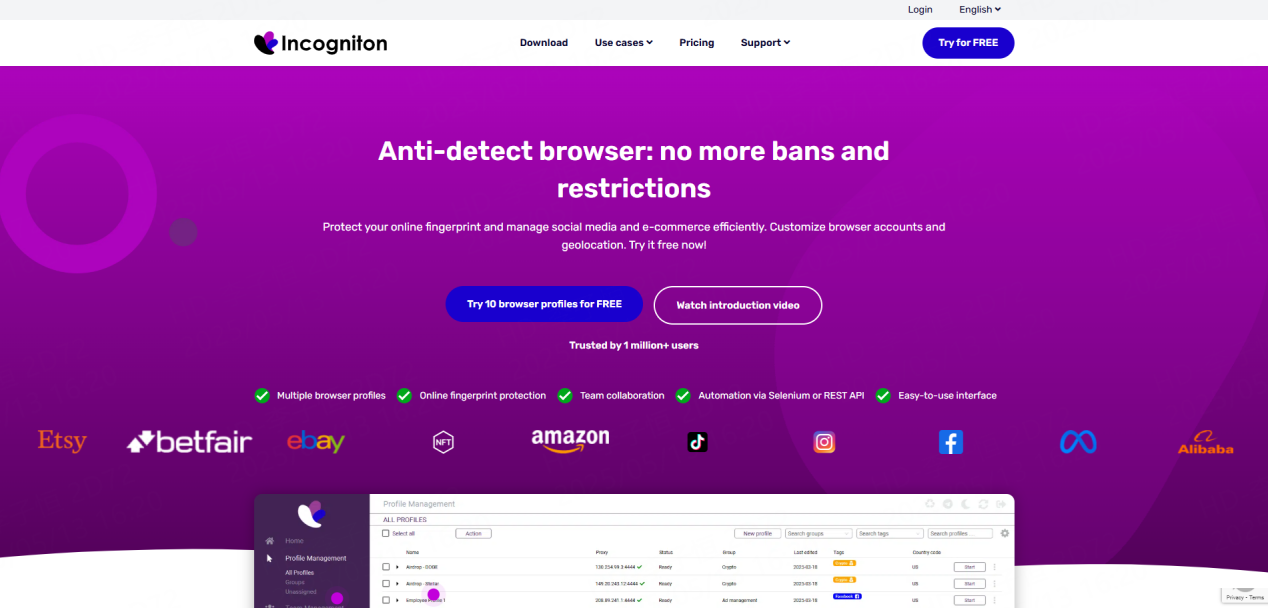 無論您從事跨境電商、社交媒體自動化、網頁數據抓取,或數位廣告推廣,Incogniton 都提供穩定、隱密且可擴展的操作環境,完美符合您的業務需求。