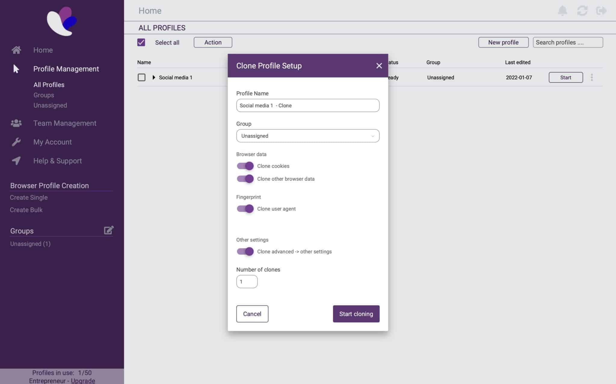 安裝完成後,開啟 Incogniton 並建立新的檔案。您也可依據用途將檔案歸類至不同群組,以便後續管理與查閱。